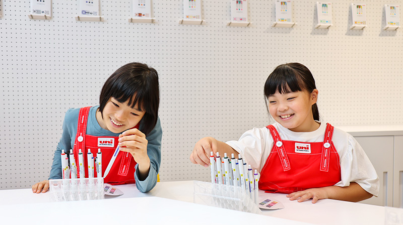 ボールペンの仕組みを知ったあと、たくさんの色の中から好きな3色を選びます。選んだボールペンで専用のパッケージの色をぬったり、