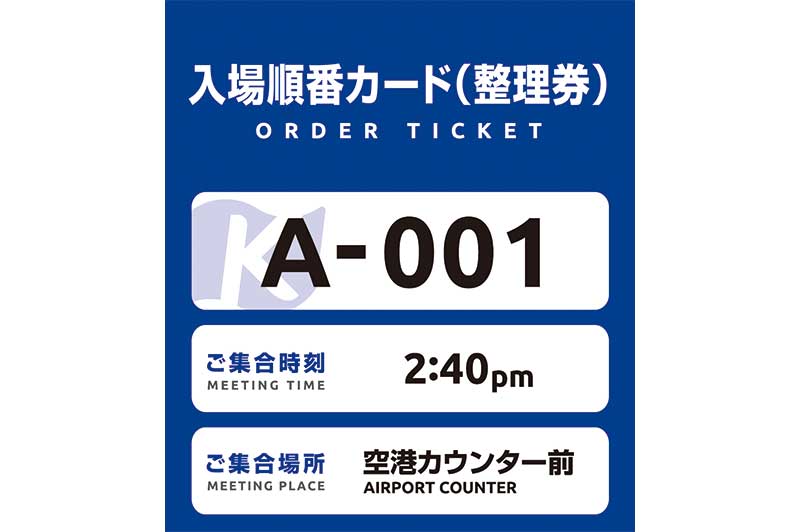ご予約1件につき代表者(大人)1名でお並びいただけます。ただし、代表者1名で複数の予約番号を持って並ぶことはできません。荷物だけを置いて並ぶこともできません。