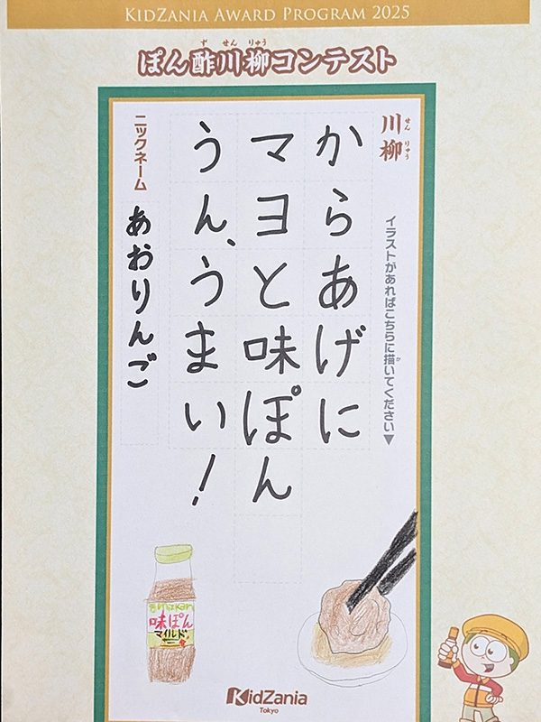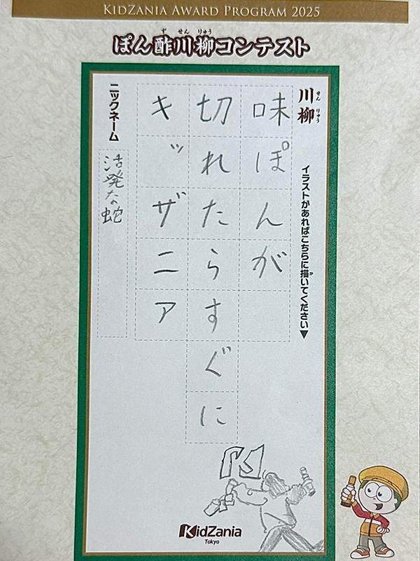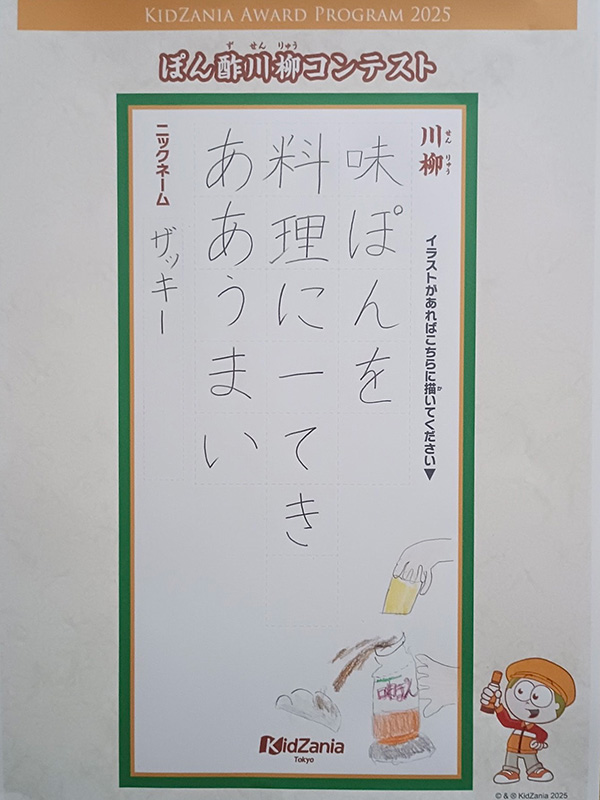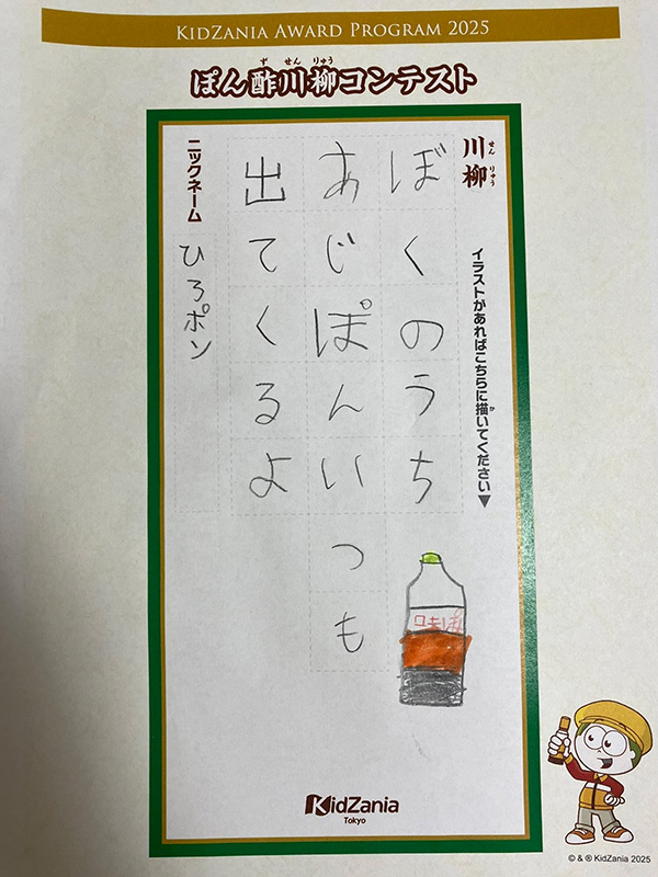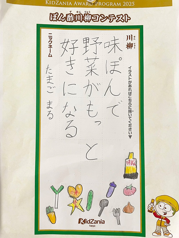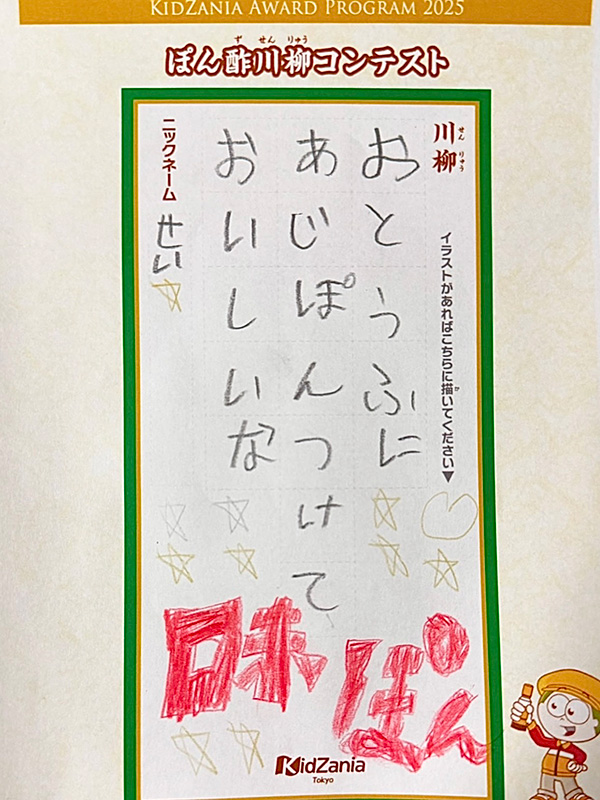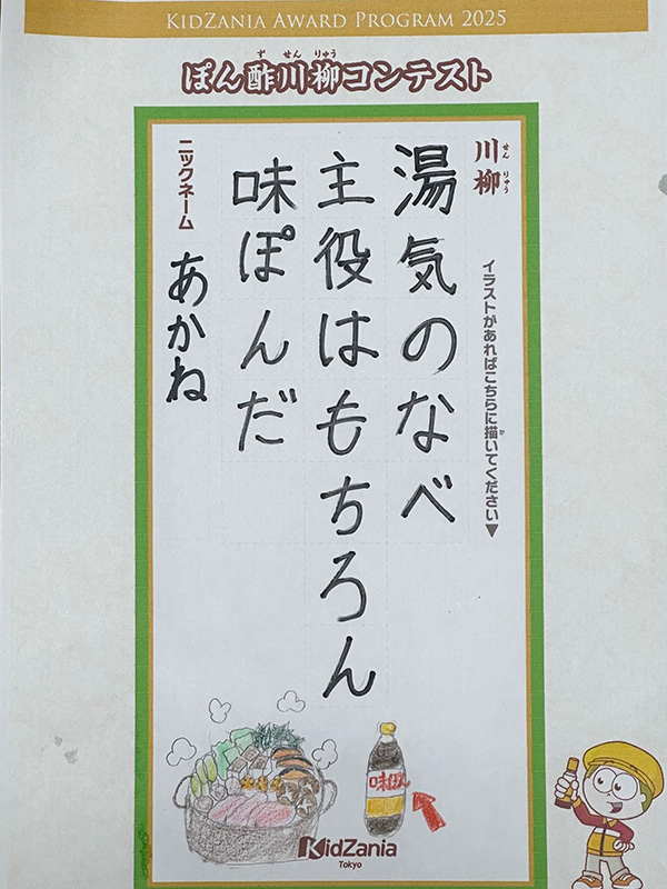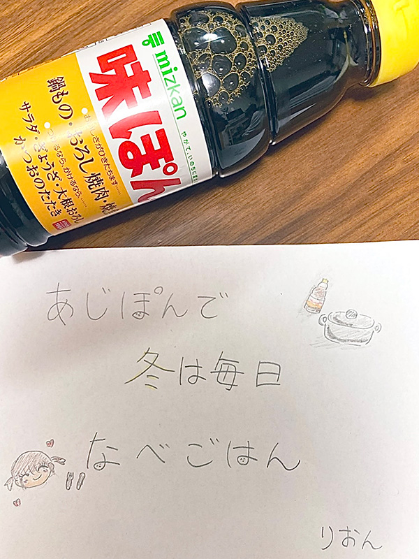 「ぽん酢川柳コンテスト」では、11月10日 の「味ぽん🄬の日」にちなんで、味ぽん🄬の思い出やエピソードを表現した川柳を募集しました。 思いが込められた作品を多数ご応募いただき、ありがとうございました。