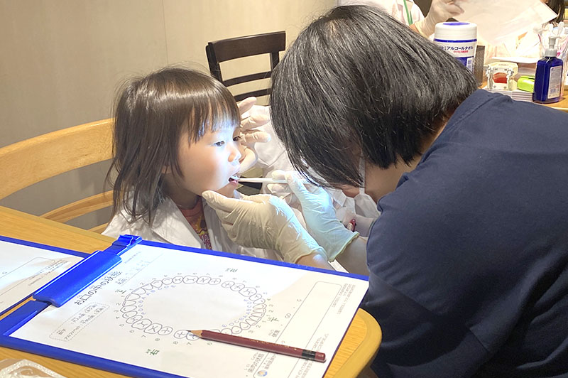 2人1組でおたがいに歯科健診をします。歯科医師からお口のケアも学べます。