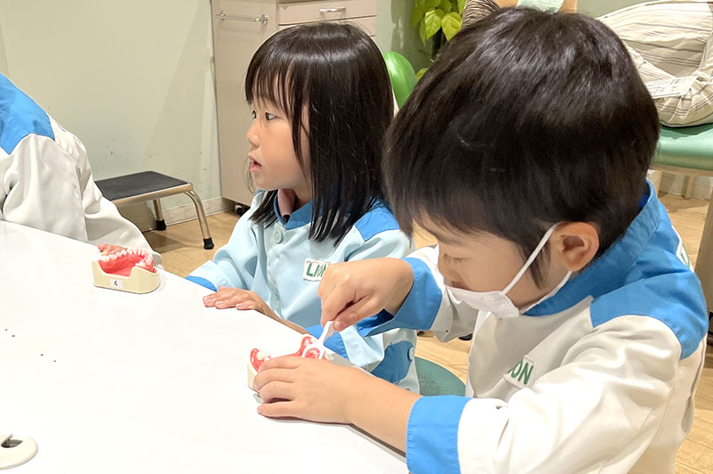 歯科医院では、通常のアクティビティに加え、デンタルフロスを使って模型の歯みがき体験ができます。